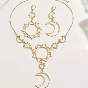 Embrace the celestial beauty with this exquisite gold necklace and earring set. Featuring intricate sun and moon designs, this set adds a touch of elegance to any ensemble. (Zinc Alloy)