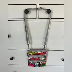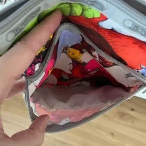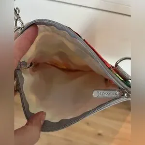 Vintage Y2K 2007 collaboration bet LeSportsac and French cartoon illustrator Fafi. Allover "Fafiness" limited edition print in neon-bright pink, yellow, red & green. Huge Alice in Wonderland vibes. Super rare! Made of indestructible, washable nylon, with silver crossgrain ribbon trim.
