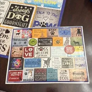 Enjoy assembling this vibrant dog-themed puzzle featuring playful designs and quotes. Perfect for dog lovers.