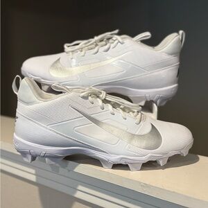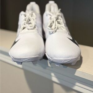 Stylish athletic cleats in white with silver accents. Perfect for sports enthusiasts.
