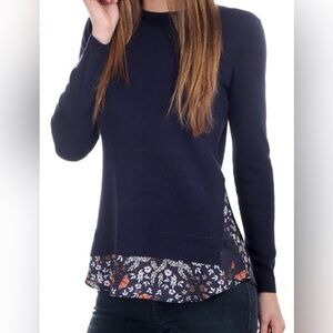Ted Baker London “Sidni” Kyoto Garden layer-look sweater in navy blue with a soft knit bodice and a flowy floral hem that gives the look of a blouse layered underneath. Ted Baker size 1; based on measurements it fits closest to a US 4 / small.