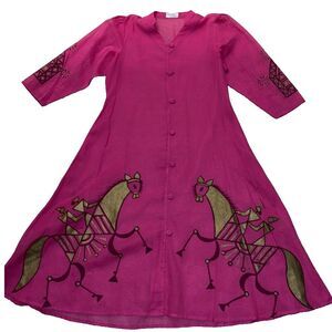 Surinder Creations Pink Hand Painted Horse Print Dress Bohemian Button Front Cover Up