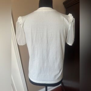 Transparent sleeves with ruffle detail at shoulder.