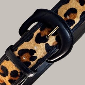 Vintage Avignon wide belt made from genuine hair-on leather with bold leopard print and smooth black leather trim. Features a sculptural black buckle and quality craftsmanship. Great statement piece for denim, dresses, or layering over knits.