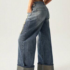 Medium Wash Casual Women's Distressed Letter Patch Loose Fit Denim Jeans
