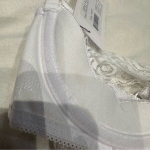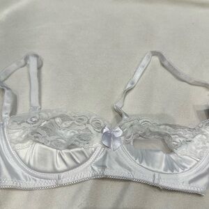 Oh La La Cherie Peekaboo Bra Lace Satin White Size Small NWT. Mesh back. Adjustable straps. Underwire. Padding on the under boob area. Cutout. Faint makeup stain on interior - see last photo.