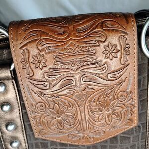 Approximately 15"W x 10"T with an 11" strap drop. Open and zippered pocket on the back and in the main compartment. Bag is 30% Cow Leather. Minor wear on the bag. No rips or holes. A couple of stains as shown in pictures. There are a few dog hairs (I tried to get them out with a lint roller but I haven't gotten them all). Smoke free/Dog friendly home.