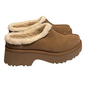 UGG Tan Suede Mules with Plush Cream Trim
