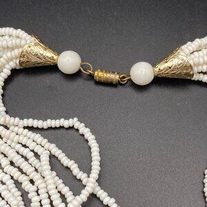 White Seed Bead Multi Strand Necklace Gold Tone Filigree Caps Glass 32" Vtg READ