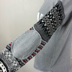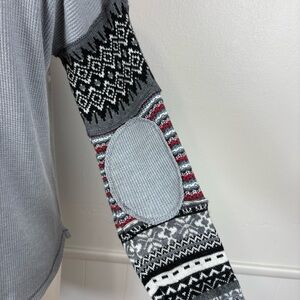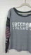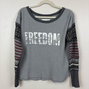 This pullover top has large graphic "FREEDOM" in distressed font on the front. The sleeves are knit sweater sleeves with Fair Isle pattern and the long cuffs are a darker contrasting gray. There are waffle knit patches on each elbow. Dropped shoulders. Boatneck has darker gray contrast.