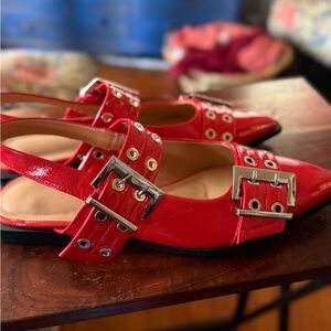 Bold red flats with striking buckle accents. Perfect for a chic look.