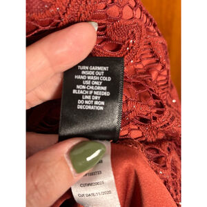 Make a statement in this Torrid lace cocktail dress featuring a shimmering rust red/mauve pink tone and intricate paisley lace overlay. Designed in a flattering fit-and-flare silhouette, this sleeveless dress includes a high neckline with sheer lace detailing, a keyhole back, and soft lining for comfort and movement.