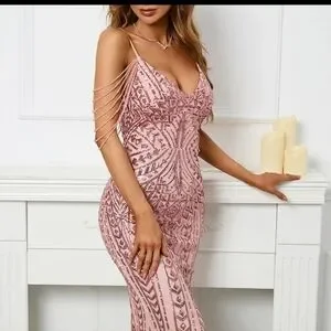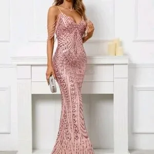 Pink, Cami, Backless, Sleeveless, Fringe Rhinestone Sleeves, Contrast Sequined Mermaid Maxi Gown for Special Events