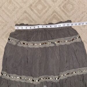 Cider A-line lace stitch midi skirt with tiered layers and stretchy elastic waist. Size large measuring approximately 28" at the waist (unstretched) and 30" total length. Clean and in excellent condition, only worn once. Only imperfection of note is a very small pull as seen in the last photo