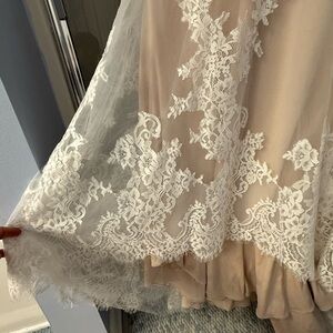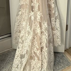 Elegant lace wedding dress with intricate floral patterns. Features a plunging neckline and sleeveless design. Perfect for a classic bridal look. Only worn 2 times, once at the bridal boutique when we purchased and once for alterations. Not worn again. Purchased summer end of 2023. Size 10. Fits nearly true to size. My daughter in the dress is 5’9 170 pds and wears an 8-10 normally. Dress has been altered very minor on the sides and minor on the length. Already bustled. There is room for additional altering if you need it.