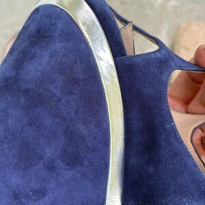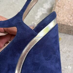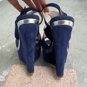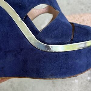These platforms are royal blue with silver. Please check out the pictures. They’re not perfect but they are still in good condition. Platform height is 1.75 inches heel height is 5.5 inches.