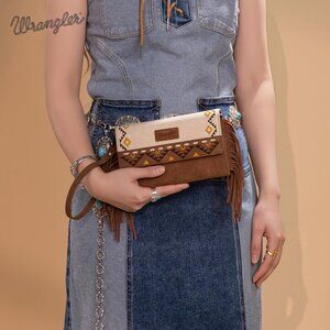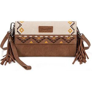 This rustic-chic crossbody wristlet wallet for women features western style fringe detailing and aztec embroideries. The removable crossbody strap converts it from clutch to cossbody bag instantly