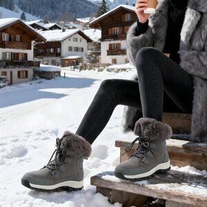 Women’s Dark Grey Waterproof Snow Boots Warm Faux Fur Lace Up Mid Calf