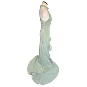 Bronx and Banco Runway X REVOLVE Nefertiti Gown in Menthol. This chic gown features a halter neckline, is sleeveless, as well as a flirty cutout and cascading skirt with ruffle details. Made from luxurious materials, this dress will have you oozing confidence at your next red carpet event