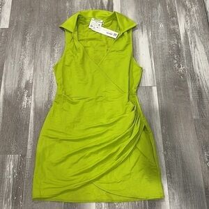 Sleeveless mini shirtdress with wrap V-neck lapel collar and side ruching detail.