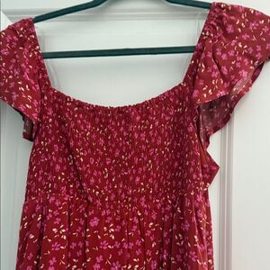 Charming red mini dress with floral pattern. Features ruffled sleeves and square neckline. Perfect for casual outings.