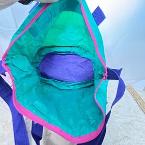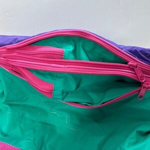 Keywords: vintage, 90s, tote bag, travel bag, gym bag, shoulder bag, teal, purple, color block, nylon tote, retro, athleisure, accessories, womens bag, 90s fashion