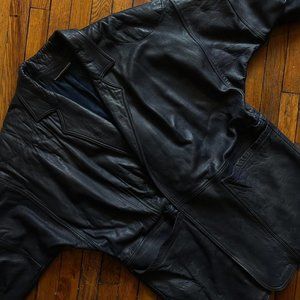 Vintage 80s/90s Monarch New Zealand Hand Tailored Women's Dark Blue Real Leather Medium Long 3/4 Sleeve Oversized Open Cape Jacket.