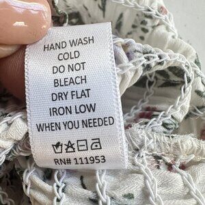 Hand wash cold, do not bleach, dry flat, iron low when needed. RN# 111953