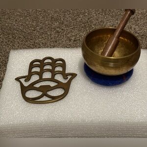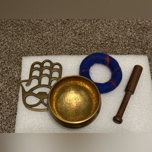 Elegant brass meditation bowl with a wooden mallet. Ideal for mindfulness practices. 3 5/8 in diameter. Pre-owned by me in good condition . I just want something different. The brass Hamsa hand bottle opener is included with purchase. I bet you could put a magnet on the back and hang it where you’d like. . The symbolism of the hand represents strength, good fortune, blessings, abundance, and feminine power.