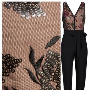 A floral-embroidered bodice adds an extra hint of romance to a contemporary-chic jumpsuit complete with a waist-tie detail.