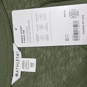 NWT Athleta Breezy Scoop V-neck Short Sleeve Tee Olive Women's Size XXS, lower impact materials, easy care, breathable, semi shear