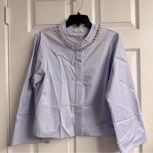 Chic light blue blouse with elegant embellishments. Perfect for a stylish look.