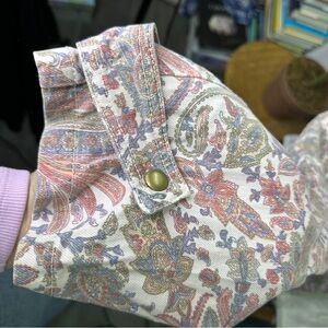 Size small long sleeve collard paisley jumpsuit with tie belted detail buttons down the front purple pink color