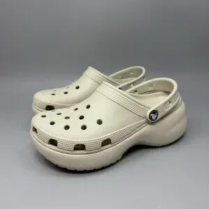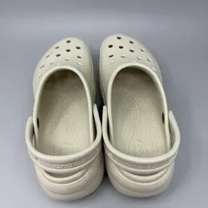 The Crocs Classic Bae Platform Clog Shoes in women's size 8 are slip-on comfort clogs in a beige tan color. Made with synthetic materials, these clogs feature a cushioned foam insole for maximum comfort and breathability. With a standard shoe width and a classic platform style, these Crocs are perfect for casual wear and are sure to provide all-day comfort for the wearer.