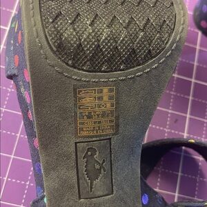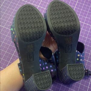 READ Description Rocketdog (bought through Modcloth) size 8 rainbow dot heels. Heel is 4.5 inches high, block style. These are unworn, however the back of the footbed has started to lift up. Please do not purchase without viewing all photos (I suspect this would easily be fixed with shoe glue). Very cute rainbow polka dot heels sold through Modcloth a few years back. (If I can find a stock photo, will add to the end of the listing).