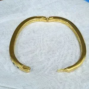 Sparkly rigid gold hinged cuff or bangle style bracelet from Swarovski crystal is marked with their signature swan. Gold plated. Green and clear crystals are pave set and very festive. Very good condition. Please note there are some light scratches on the bracelet consistent with wear. This would make a great gift for your loved one this holiday season!