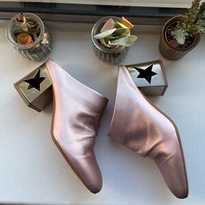 These iconic retro TIFFI star‑heel slip‑on mules in soft pastel pink feature a sculptural metallic block heel with star cut‑out detail, fully leather‑lined and slip‑on ease. Crafted from glossy PVC upper with a polished leather sole and lining — a perfect contrast of sheen and structure. Heel height approx 9 cm (about 3½″).