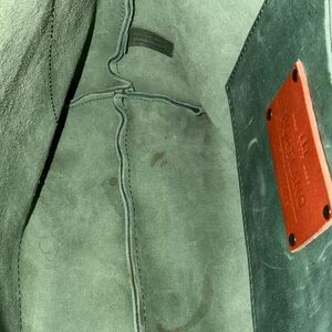 Elegant green tote with sturdy brown leather straps. Includes a stylish front pocket and decorative scarf.
