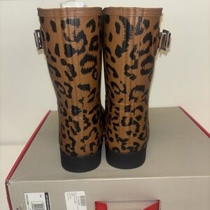 Stylish Hunter boots with bold leopard design. Ideal for rainy days.