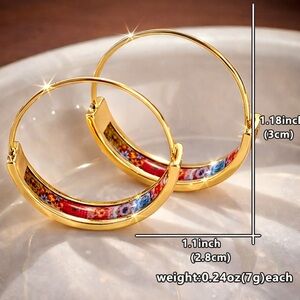 These stylish, lightweight hoop earrings feature a bold gold tone finish with a vibrant, multicolored resin inlay. Designed for comfort and style, they are perfect for both everyday wear and special occasions