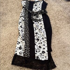 Stylish black and white floral patchwork dress. Features a unique design with lace details. Gorgeous!