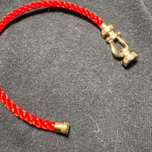 Fred Force 10 bracelet with a red braided cable and a rose gold color buckle set on a red-braided textile cable. CZ diamonds.