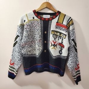 Stunning unique vintage knit sweater with military style design. Reminiscent of Schiaparelli's Trompe L'oeil designs. Size S. Measures approx 21" flat pit to pit and 21" long.