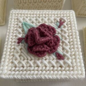 Set of six cream crochet trinket boxes with floral designs. Features red, pink, blue, and purple flowers. The boxes are made using a needlepoint on a plastic canvas base 3 1/2’ x 3 1/2’ x 2’