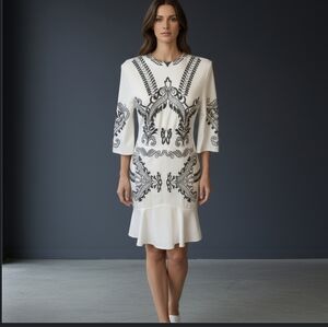 Stand out in style with Ave Rara's stunning white knit dress featuring intricate black embroidery and a flirty ruffle bottom.