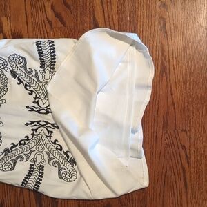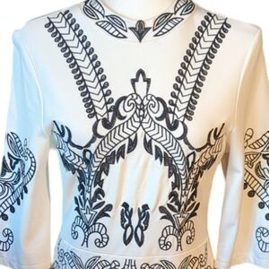 Designer white knit fit & flare ruffle bottom white dress black embroidery Sz 2
