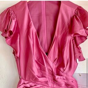 Made from lustrous raspberry pink satin, this flirty dress features flutter sleeves, a crisscross bodice with pleated detail at the waistline that wraps to a low cut open back, and a diagonal layered ruffle that starts at the hip and dips past your toes. Wear her as a wedding guest, mix and match bridesmaids, gala, prom or red carpet event.