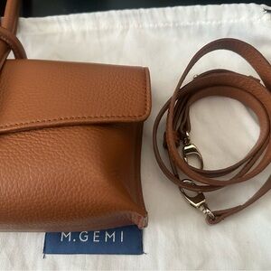 Chic tan leather wristlet by M. Gemi. Features a sleek design with a secure closure. Ideal for versatile styling.