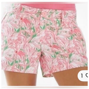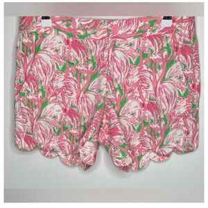 These are pre-owned Lilly Pulitzer "The Buttercup Short" shorts, Pink Colony print. They feature a vibrant flamingo print in shades of pink and green on a white background. The shorts are made of 100% cotton. They have a scalloped hem, a button closure, and belt loops. There are no visible stains, tears, or other imperfections. The shorts are in good condition. Measurement laying flat across 15”, rise 7”, inseam 5”