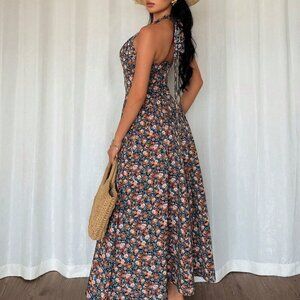 Multicolor Boho Womens Elegant A-Line V-Neck Cinched Waist Flared Hem Back Dress